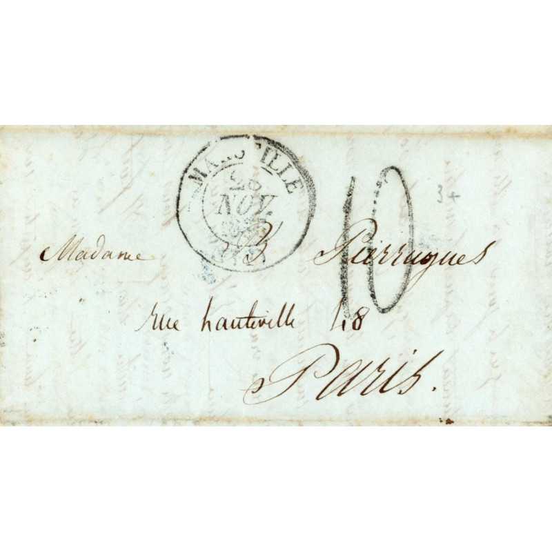 Cachet noir manuscrit de taxation : "10" (port dû de 10 décimes, selon la distance Marseille–Paris).
