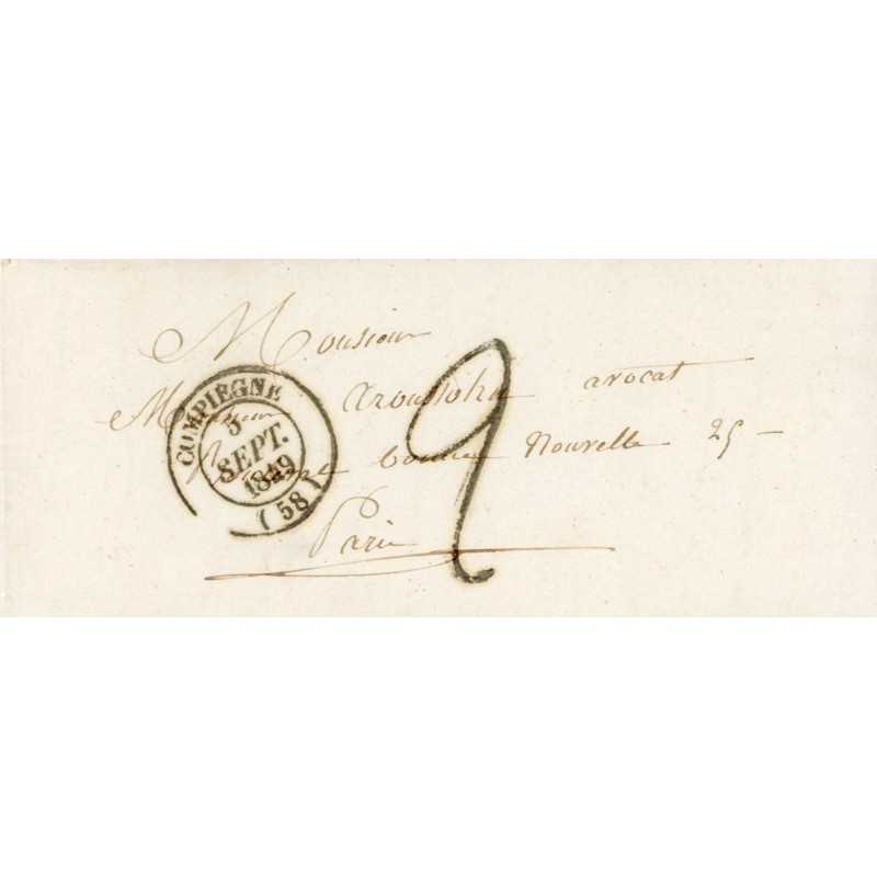 En 1849, le tarif postal intérieur pour une lettre simple (moins de 7,5 g) de Compiègne à Paris était de 9 décimes, ce qui explique la marque manuscrite "9".